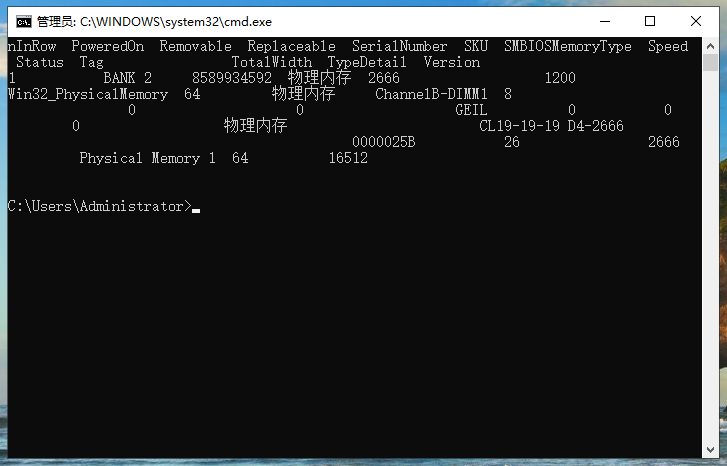 2、在命令提示符中輸入“wmic memorychip”回車,即可查看內存的型號和頻率。