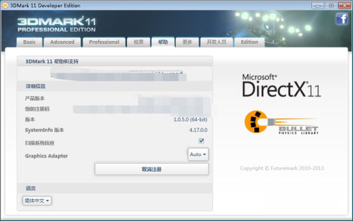 5、最后,我們在【幫助】選項卡中,查案到3dmark軟件的詳細信息,如產(chǎn)品版本、注冊碼、版本等等;