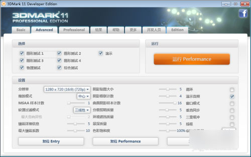 2、然后切換到【Advanced】選項卡,選擇使用圖形測試或者物理測試、綜合測試,再設置分辨率、縮放模式等等;