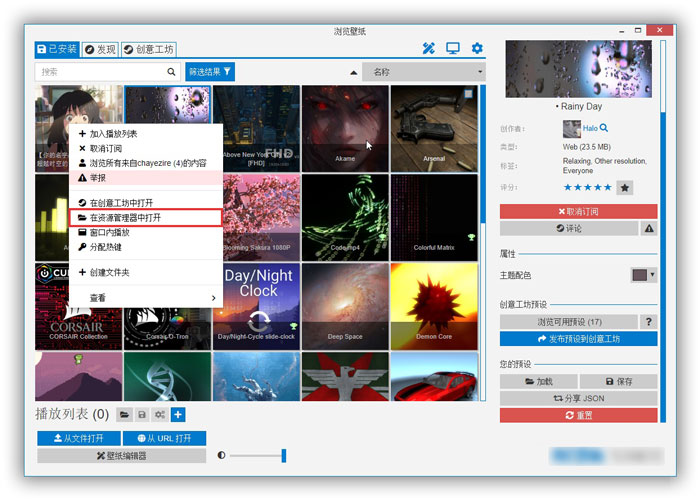 2.打開之后,在【已安裝】中找到我們下載好的視頻壁紙,右擊選擇【在資源管理器中打開】;