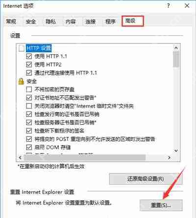 2、轉(zhuǎn)到【高級】標(biāo)簽,在底部點擊【重置】按鈕;