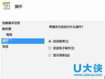 6、在【操作】窗口,選擇【啟動(dòng)程序】,然后點(diǎn)擊【下一步】。
