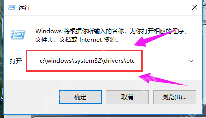 在運(yùn)行文本框中輸入“c:\windows\system32\drivers\etc”,然后點(diǎn)擊“確定”按鈕即可。