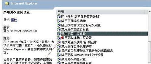 3、在新窗口中我們找到“禁用IE主頁(yè)設(shè)置”選項(xiàng)點(diǎn)擊選擇禁用更改主頁(yè)設(shè)置里面,然后我們把屬性窗口的已經(jīng)啟用往下拉,就可以輸入我們需要的主頁(yè)網(wǎng)址,點(diǎn)擊確認(rèn)關(guān)閉窗口。